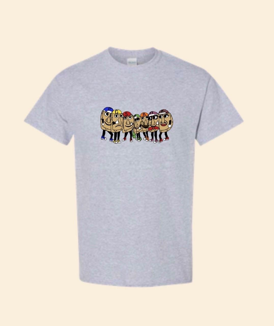 This design is pressed onto a Gildan heavy cotton shirt in a light grey color