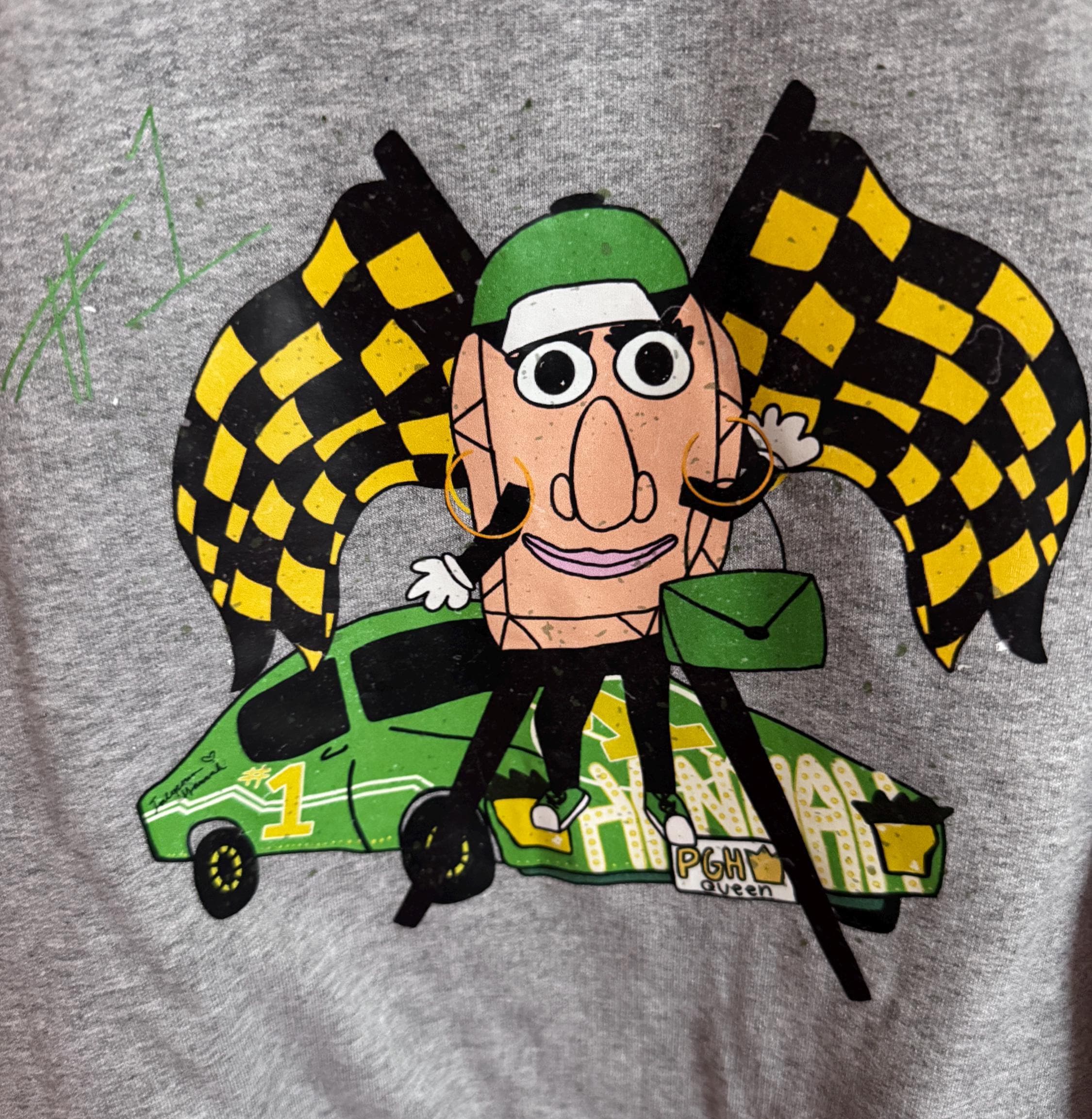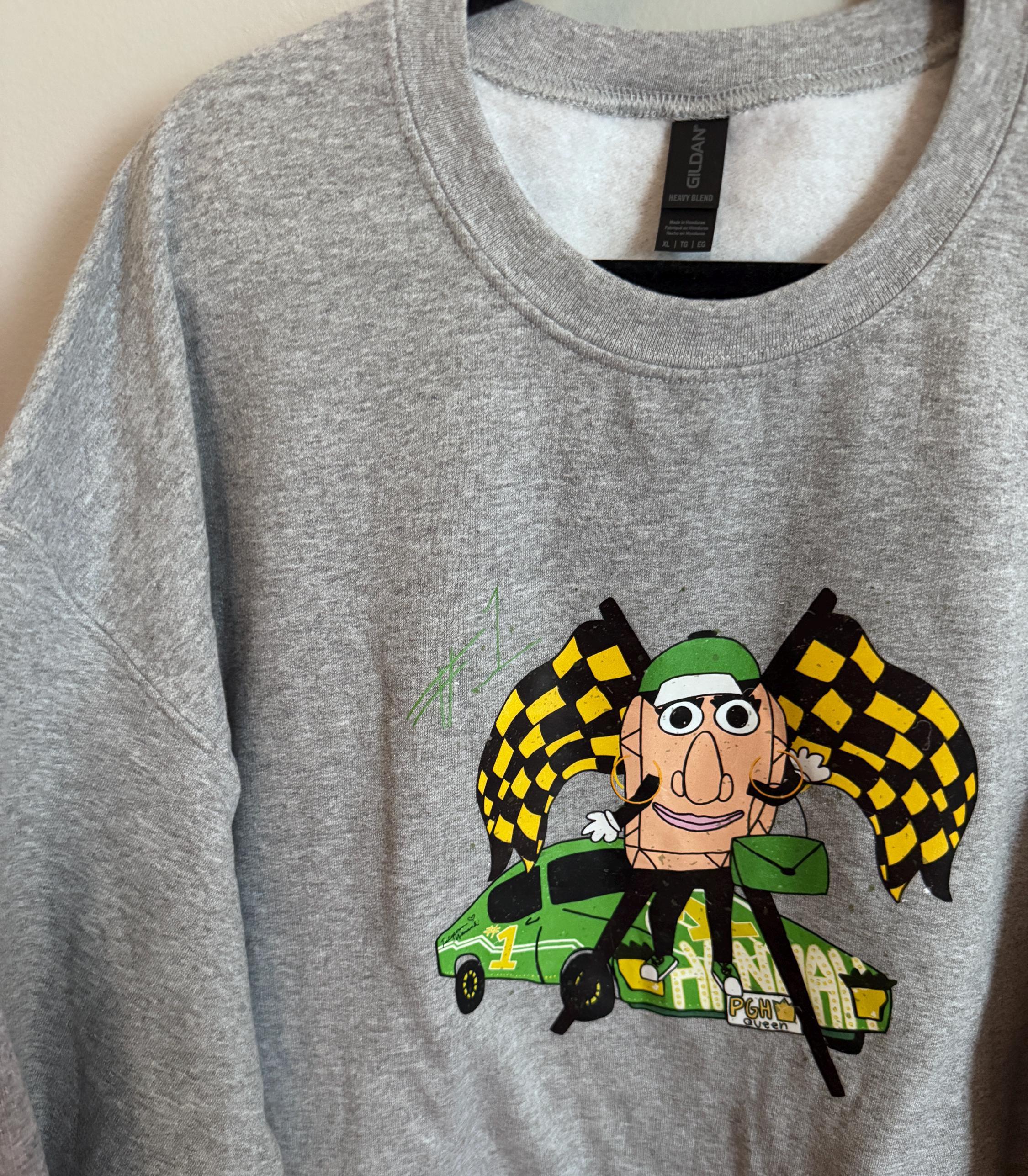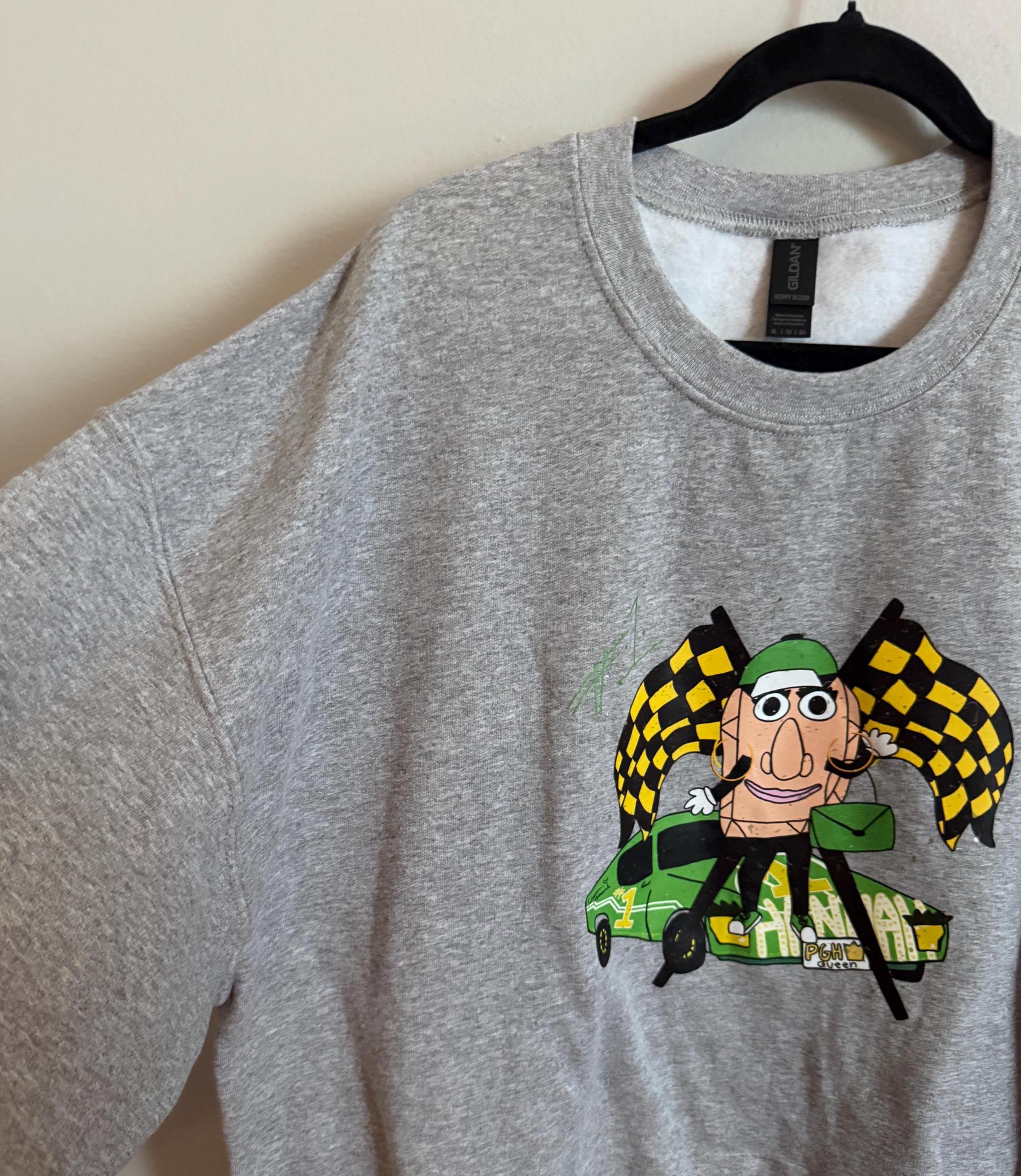 Pittsburgh Pierogi Racing sweatshirt! Hand-drawn design by AMillThis design is pressed onto a Gildan sports grey colored-sweatshirt - best washed inside out and hung to dry!
