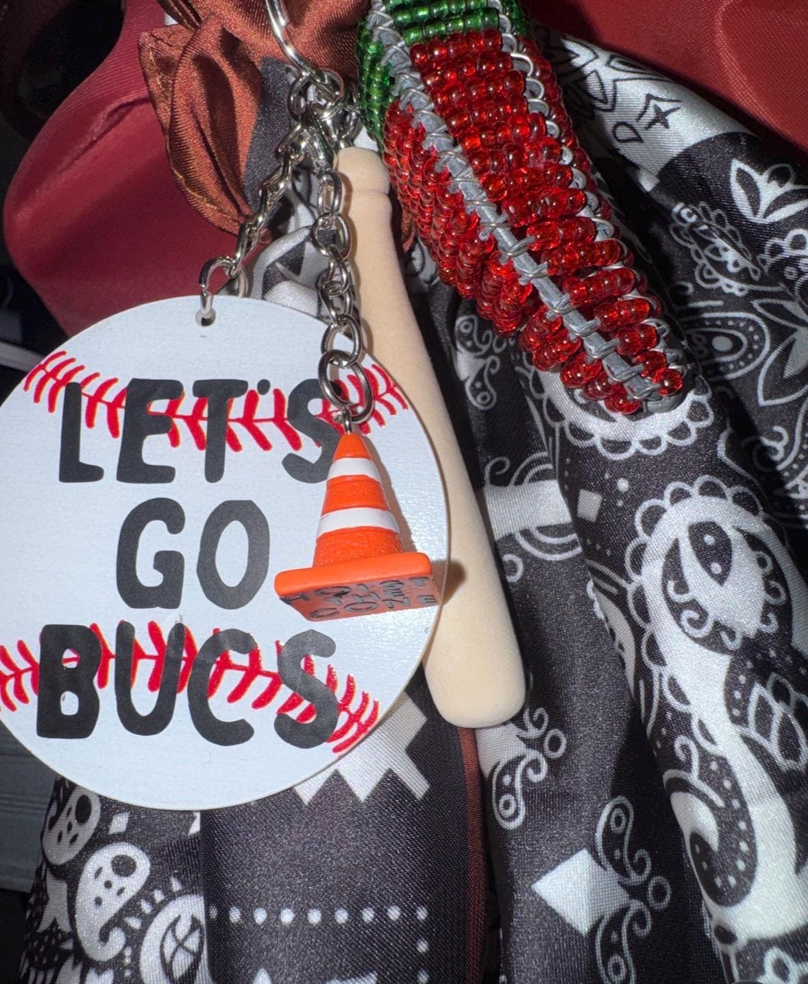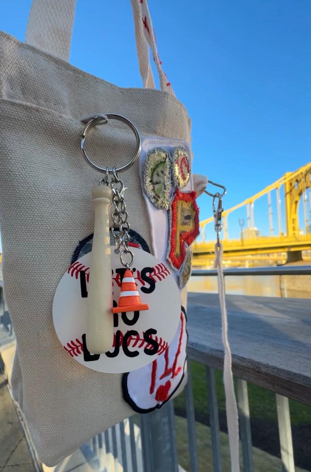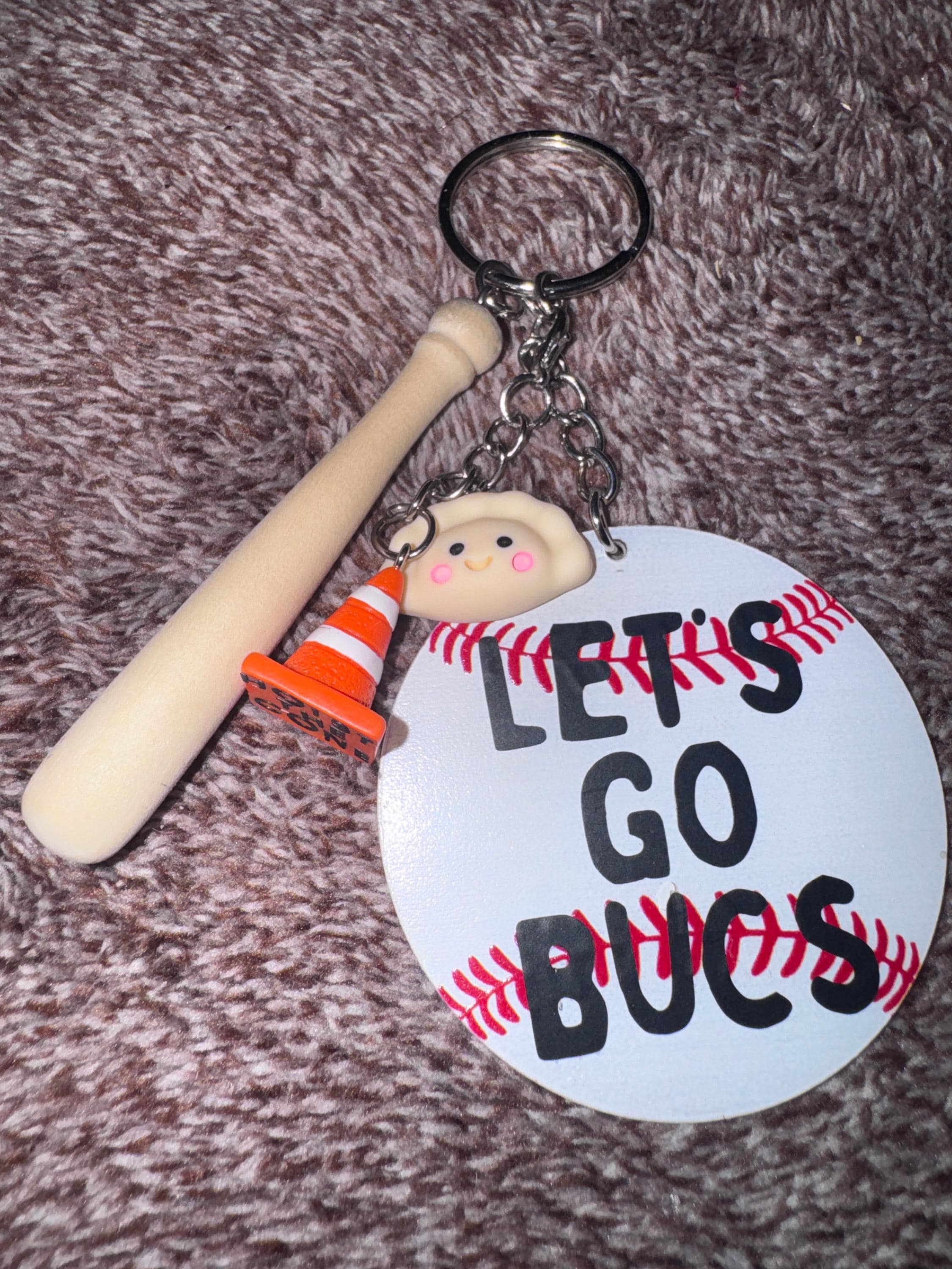 This is a baseball-shaped keychain that reads "Let's Go Bucs"! This keychain features a smiling Pierogi charm and a Hoist the Cone charm!